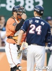 5회초 무사 주자 만루 두산 오재원 타석에서 교체 투입된 조인성에게 두산 오재원이 말을 걸고 있다. 한화 조인성은 이날 역대 14번째로 1900경기를 출장했다. / rumi@osen.co.kr  [OSEN 2016-07-02 19:39:00] | ||||