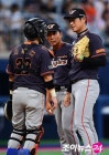 6회말 넥센 공격 1아웃 후 한화 배터리 이태양, 차일목이 조인성, 박정진과 한꺼번에 교체돼 물러났다. 교체 지시를 하러 나온 이상군 코치가 이태양 차일목과 대화를 나누고 있다. /고척돔= , 생생한 라이브캐스트...  [조이뉴스24 2016-09-04 16:27:00] | ||||